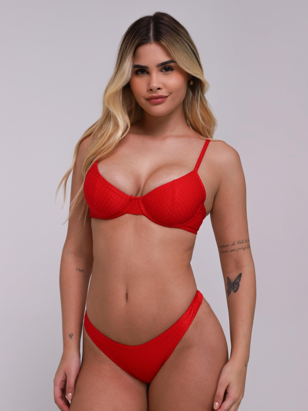 Laterais levemente largas e duplas proporcionam o encaixe perfeito. Possuiu arco de metal embutido oferecendo sustentação ao busto.