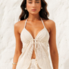 Desenvolvida em tecido de renda tropical é leve, suave e com caimento perfeito. No busto possuiu forro, garantindo zero transparência. Com amarrações em cordão de sarja.