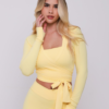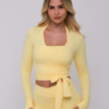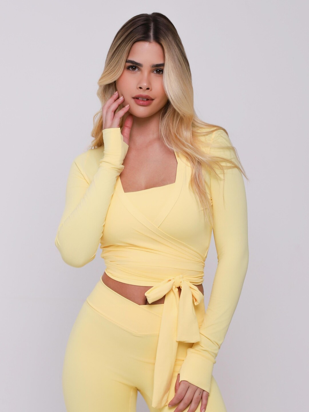 Cropped de manga longa, decote V transpassado na frente e ajustável, detalhe no punho com abertura para o dedo.