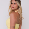 Costas á mostra e decote quadrado na frente. O modelo é frente única, mais alongada e justinha.