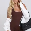 Nas costas possui um decote frente única.