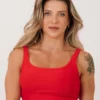 Confeccionado com um tecido canelado é super macio, flexível e confortável. O modelo é mais alongado e com decote redondo na frente e mais acentuado atrás.