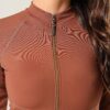 Macacão Sculp é uma peça super estilosa, com recortes que modelam e valorizam o corpo, detalhe de gola alta, zíper com puxador personalizado e mangas longas. Possuiu forro na região dos seios, garantindo muita sustentação e zero transparência, sem costura frontal no gancho.